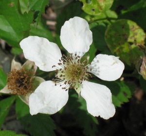 Around March and April, the plants start to grow white flowers that develop into small green berries. The tiny green berries grow red and then a deep purple-blue as they ripen. When the berries are ripe, they are tender and difficult to pick in any quantity without squashing them. The plants do not have upright canes like some other Rubus species, but have stems that trail along the ground, putting forth new roots along the length of the stem. The stems are covered with fine spines or stickers. Anyone picking these wild berries can expect to have their hands stained purple and to have many scratches from the stickers, but the taste of the sweet berries is worth the trouble.