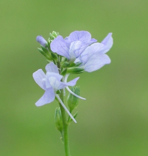 Flower: Light blue flowers loosely arranged on upper third of stem. 5 petals united at base to form a 2 lipped blossom about 1/2 in. long. The lower lip arches upwaqrd, almost closing the throat of the flower. Also has a distinctive slender spur almost 1/2 inch long.