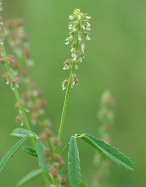 Leaves: Alternate, stalked with blade divided into three narrow leaflets, each leaflet 1/2 to 1 in. long. Margins finely toothed. |