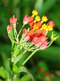 Flower to 1.3 cm across; petals 5, orange to orange-red or occasionallly yellow, united basally, reflexed or curved downward; hoods 5, orange or yellowish, erect; horns slightly lower than hood, incurved. Flowers numerous and forming rounded terminal clusters.